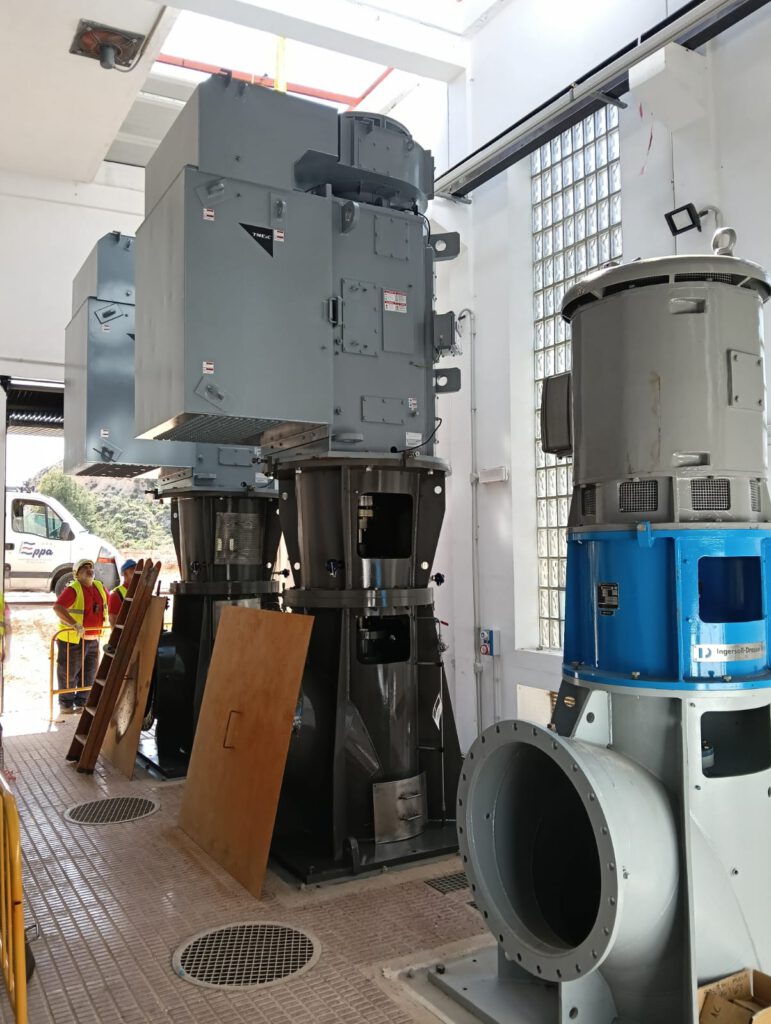 Recientemente hemos concluido las obras del PROYECTO DE OPTIMIZACIÓN HIDRÁULICA Y ENERGÉTICA DE LA ESTACIÓN DE BOMBEO DE LA MUELA donde se han instalado dos bombas capaces de elevar 7.200m3/h a 16mca cada una, equipadas con motores de 400kW a 750 rpm